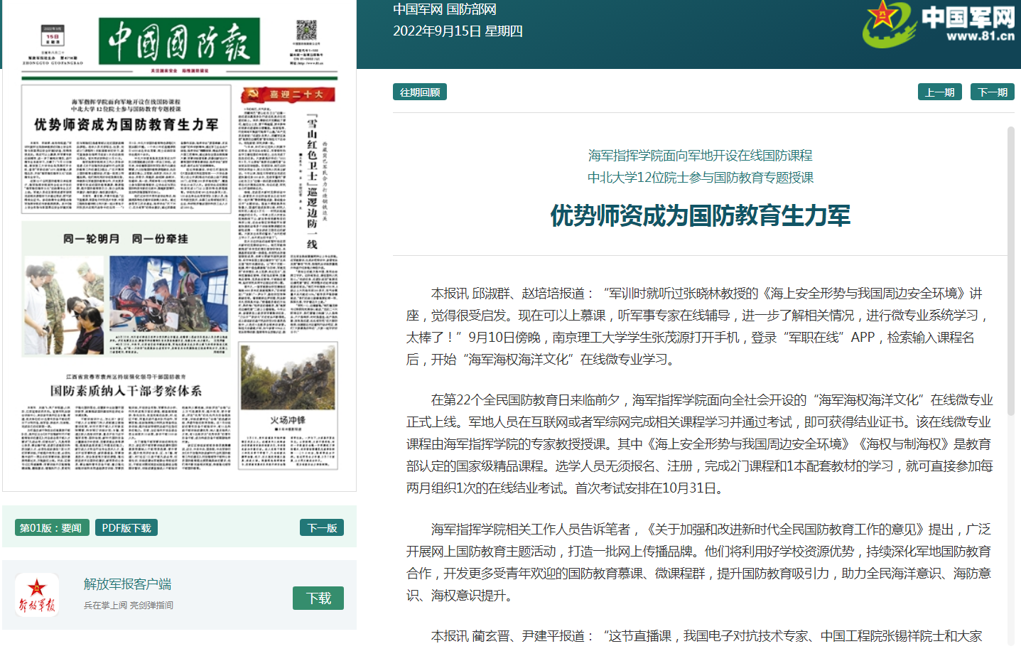 今天出版的《中国国防版》头版头条以“优势师资成为国防教育生力军---av影片