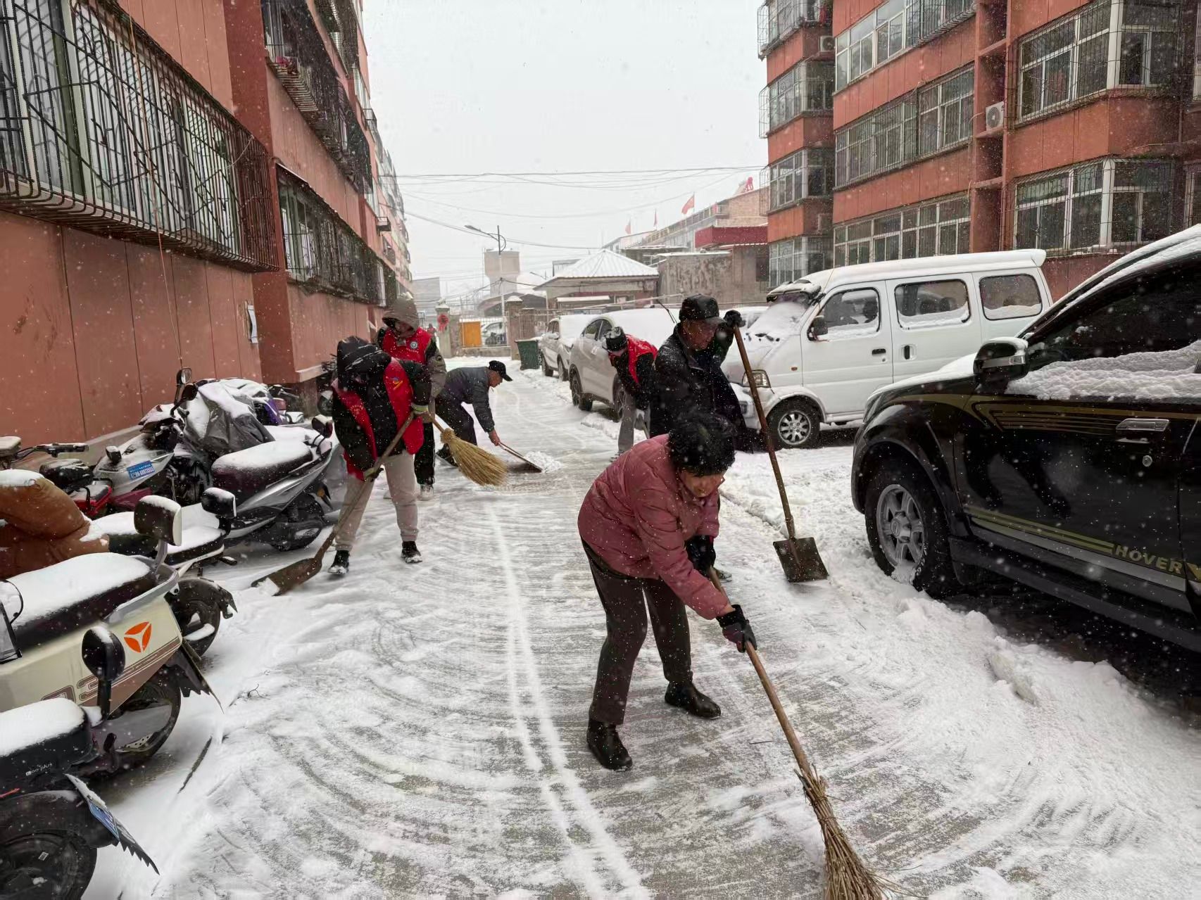 现场志愿者们分工明确、配合默契,有的奋力破除路面坚冰,有的仔细清扫零散积雪,有的合力搬运堆积雪堆,还主动为社区独居老人、行动不便居民清理家门口积雪,并耐心叮嘱出行安全注意事项。尽管双手冻得通红,大家却毫无怨言,始终保持高昂干劲,从清晨到傍晚,成功清理社区主要通行路段积雪,为居民打通了安全出行“绿色通道”。