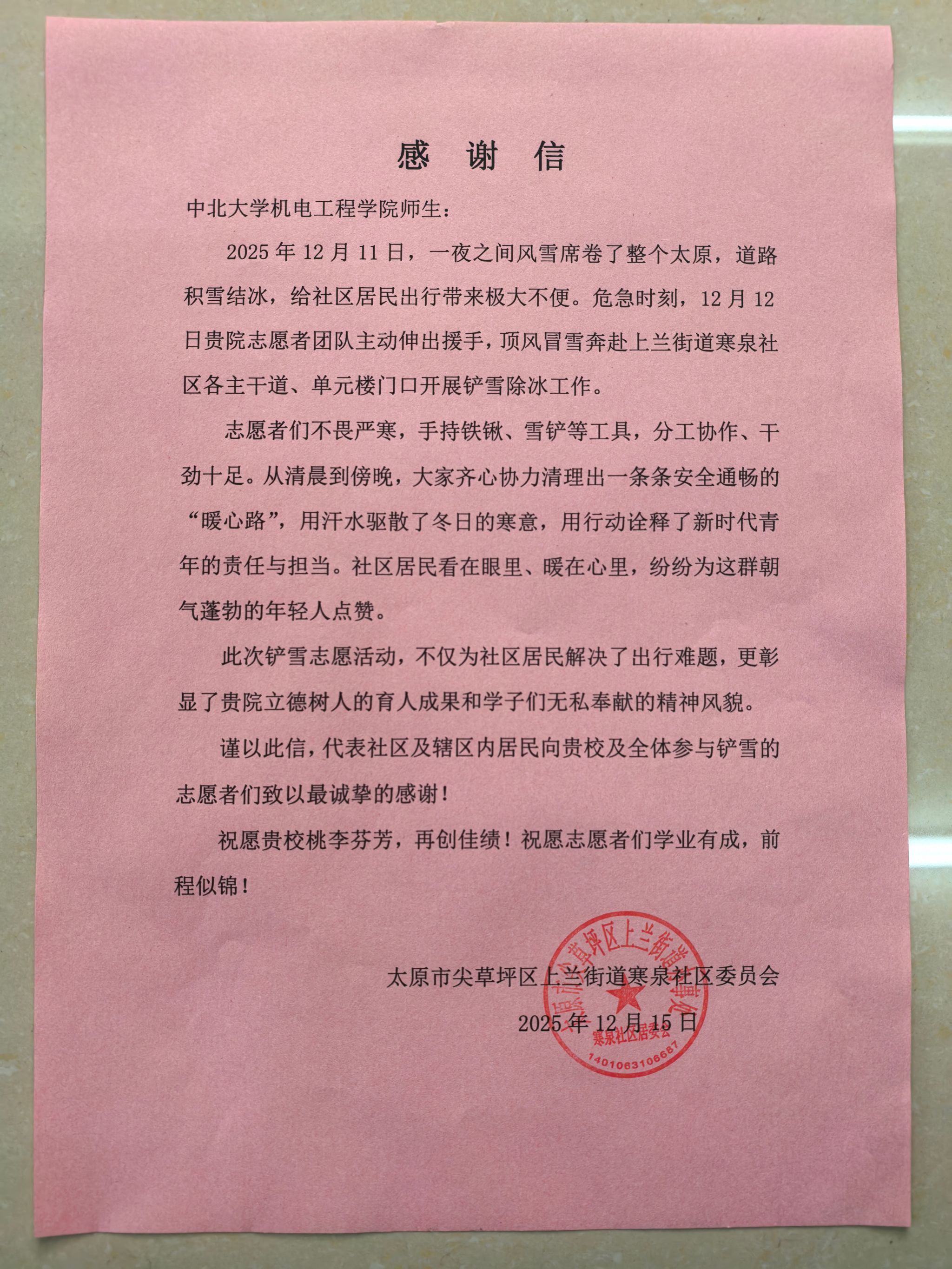 学子主动请缨,组建志愿服务队投身社区除雪一线,以实际行动践行志愿精神,赢得居民广泛赞誉,寒泉社区专门向学院发来感谢信。