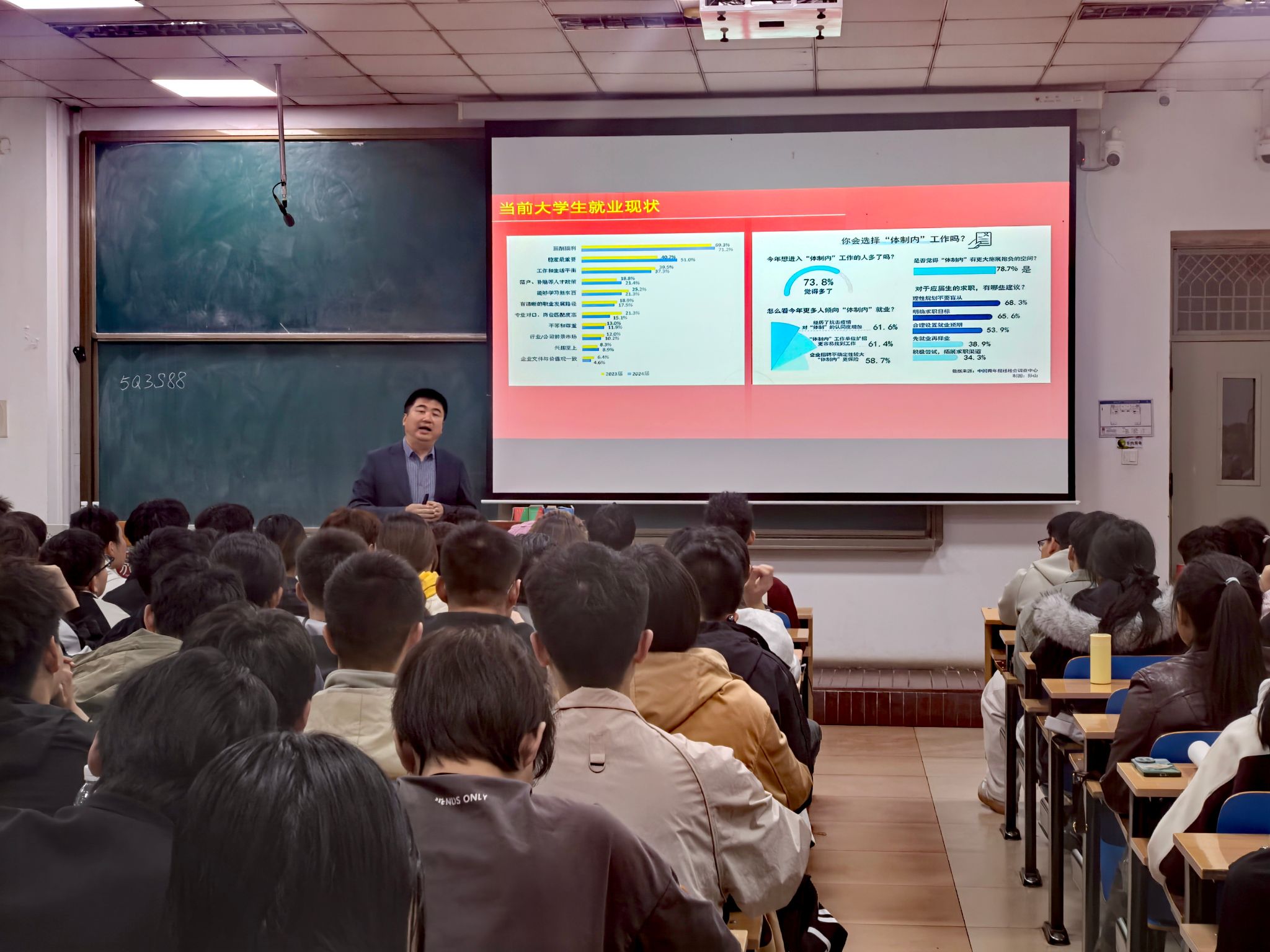 互动交流环节现场氛围热烈,同学们踊跃提问、积极交流,围绕跨专业报考可行性、应届毕业生与社会人员招录差异、文职岗位工作强度与职业稳定性、科研类岗位发展前景等问题逐一咨询。崔哲老师结合实际案例耐心细致答疑解惑,并针对不同年级学生的备考节奏与职业规划给出个性化指导建议。