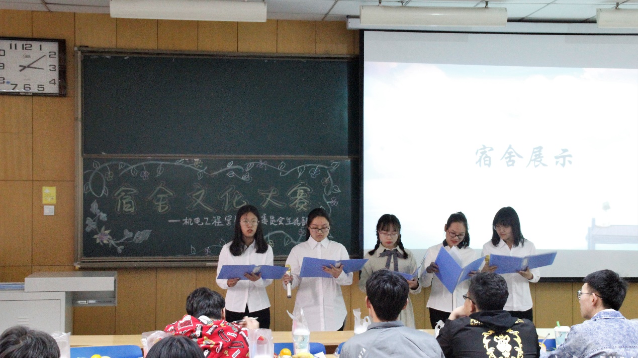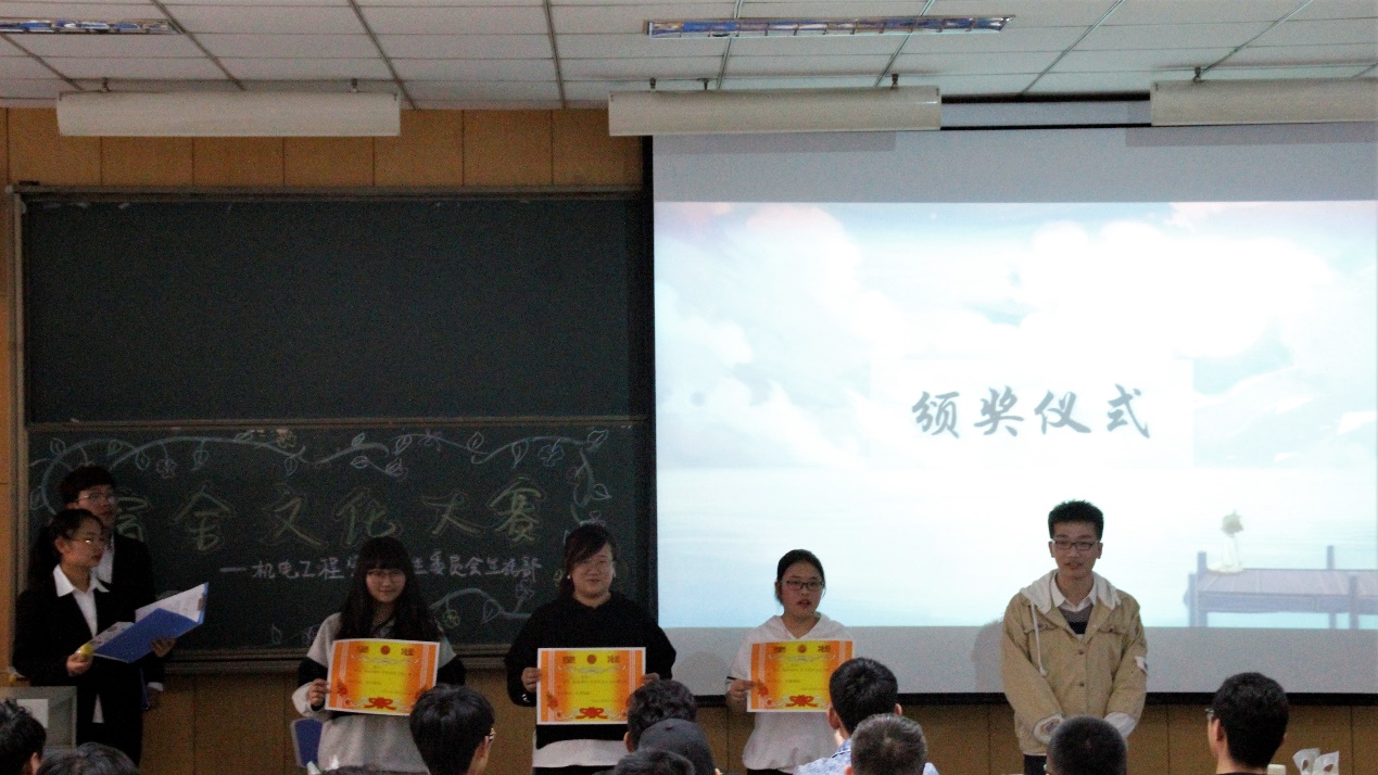 比赛开始,首先由各参赛宿舍派出一名代表上台轮流答题,主要考察与学校建设和宿舍安全相关的知识。各个宿舍代表的优异表现令现场观众掌声雷动。接下来,各个宿舍成员通过演讲为主、PPT为辅的方式来介绍自己的宿舍并带来精彩的才艺表演。同学们的寝室设计各具特色,有的凸显了浓厚的文学气息,有的展现了室友之间的情谊,也有的歌颂了青春的美好;各宿舍精彩的解说以及热情的才艺表演让在场评委和观众拍手称赞。表演结束,评委们进行了相应的打分,通过宿舍设计、答题、PPT和节目展示环节及现场投票计算分数,评选出一、二、三等奖并颁发奖状和奖品。在进行评选的过程中,现场同学积极参与了“Hi现场”互动抽奖环节,通过答题和游戏的方式获得精美礼品。最后,在和谐友好的氛围中,主持人宣布本次大赛圆满结束。