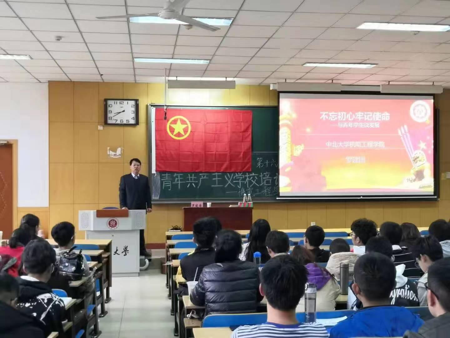 上午8时青工校培训开班典礼开始,全体参会人员奏唱国歌。之后,李晶晶老师做动员讲话,并向上一任学生干部颁发聘书。接着,团委副书记张鑫泽代表学生干部发言,干部代表张程皓带领大家宣誓。最后,主持人宣读青年共产主义学校培训细则。青工校培训正式开始。
