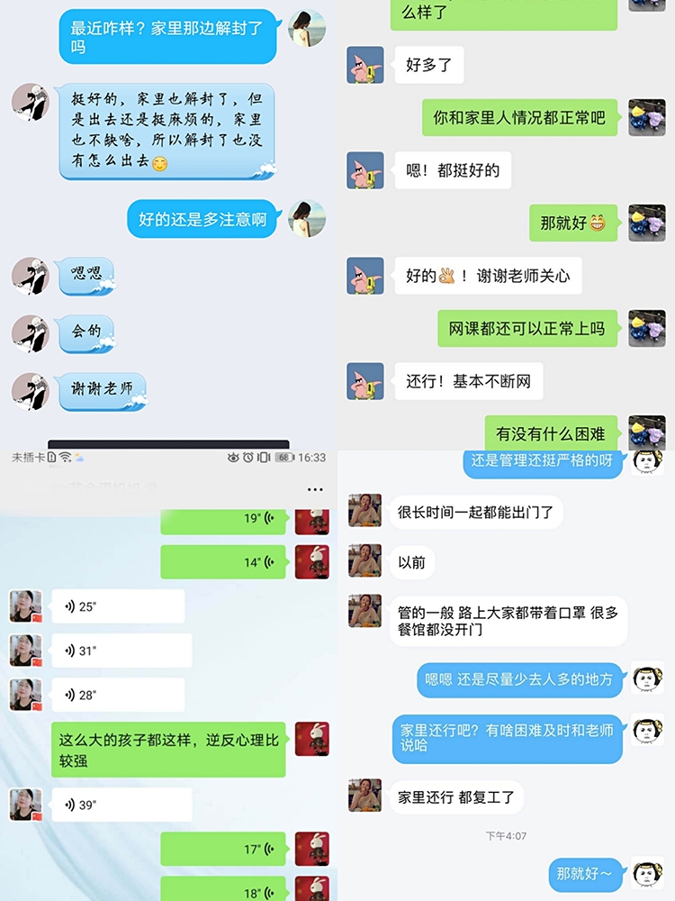 家庭居住在湖北的同学共计74名,其中家庭经济困难同学7名,学院要求扎实做好同学门的一对一联系。由班主任定期与其进行联系,为学生提供思想教育、心理疏导、学业帮扶、健康防疫指导、困难关怀等方面的服务,给予学生充分的关怀和帮助。同学们表示已经收到学校给予的经济资助,并对学校的资助表达的诚挚的感谢。