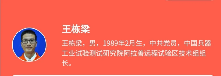 2008级武器系统与发射工程专业学生,他从2012年大学毕业后到远程试验区工作的8年时间里,刻苦学习业务知识,不断提高技术水平,注重团队建设,肯于带头实干,用智慧与汗水为武器装备科研试验作出了重要贡献。