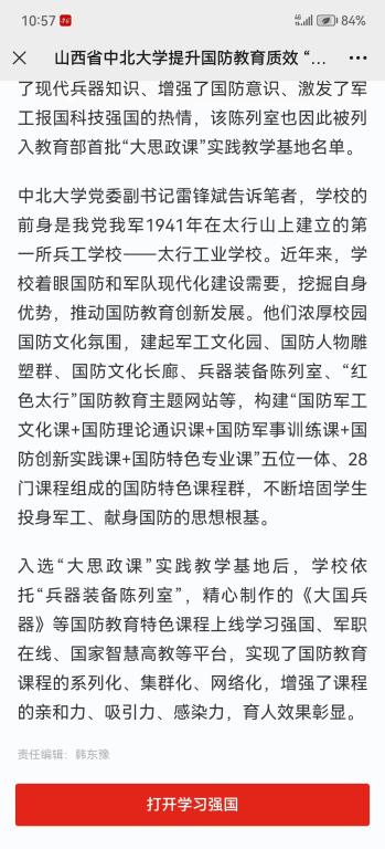 党委副书记雷锋斌告诉笔者,学校的前身是我党我军1941年在太行山上建立的第一所兵工学校——太行工业学校。近年来,学校着眼国防和军队现代化建设需要,挖掘自身优势,推动国防教育创新发展。他们浓厚校园国防文化氛围,建起军工文化园、国防人物雕塑群、国防文化长廊、兵器装备陈列室、“红色太行”国防教育主题网站等,构建“国防军工文化课+国防理论通识课+国防军事训练课+国防创新实践课+国防特色专业课”五位一体、28门课程组成的国防特色课程群,不断培固学生投身军工、献身国防的思想根基。