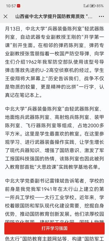 入选“大思政课”实践教学基地后,学校依托“兵器装备陈列室”,精心制作的《大国兵器》等国防教育特色课程上线学习强国、军职在线、国家智慧高教等平台,实现了国防教育课程的系列化、集群化、网络化,增强了课程的亲和力、吸引力、感染力,育人效果彰显。