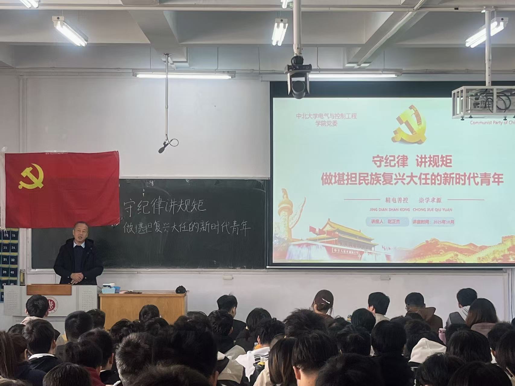 培训班第六讲,电气与控制工程学院党委书记赵正杰讲授《守纪律讲规矩,做堪担民族复兴大任的新时代青年》。课堂上老师为同学们锚定新时代纪律要求,串联“守规矩”与“担大任”的内在逻辑,说明“底线思维”是“干事底气”的前提,引导学员把纪律意识转化为担当动力。教导学员们守纪律从不是成长的“束缚”,而是让青年在正确轨道上,更笃定地扛起民族复兴的重任。