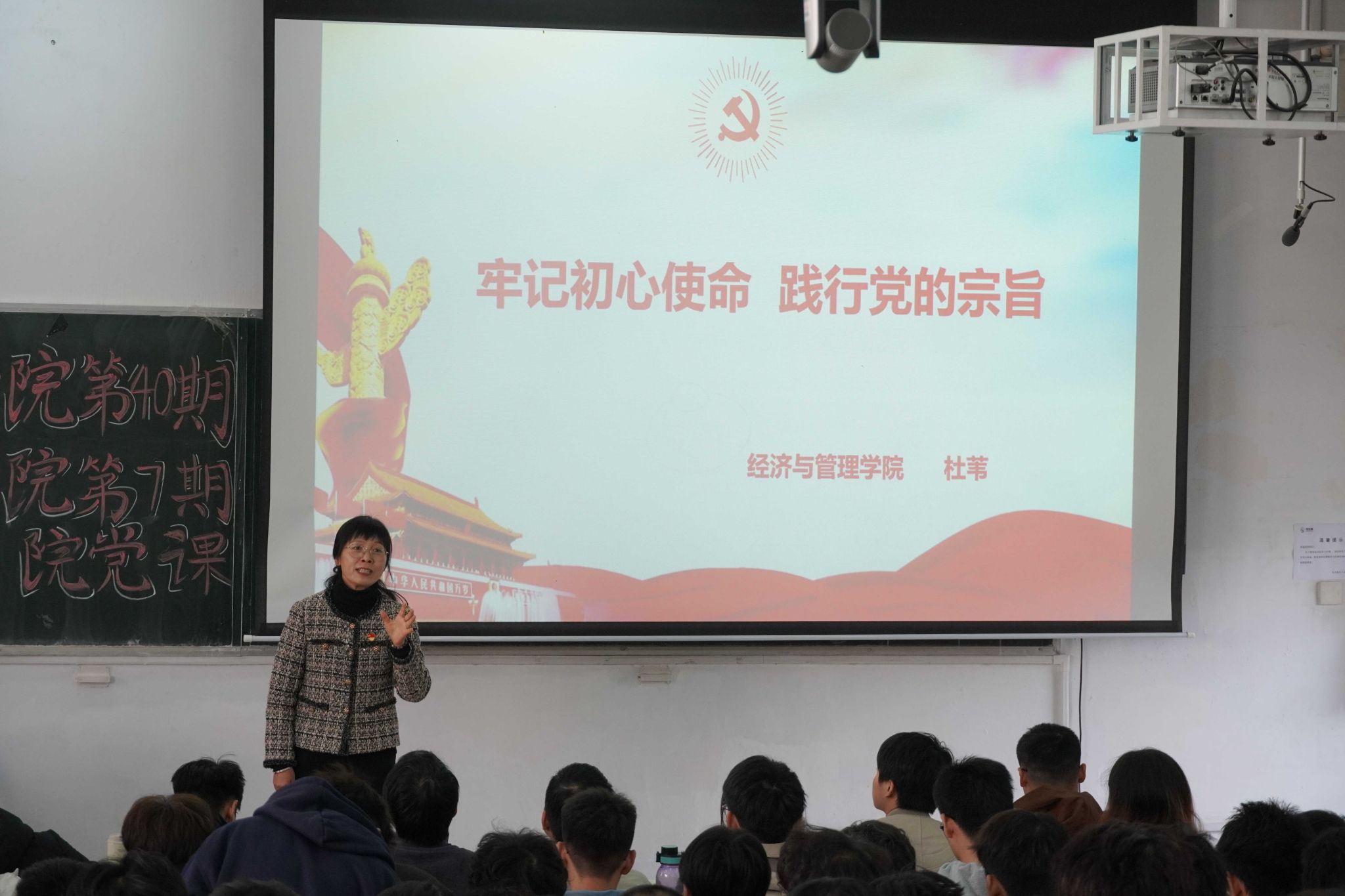 培训班第二讲,经济与管理学院党委书记杜苇讲授《牢记初心使命,践行党的宗旨》。课堂上杜苇书记既溯源党的初心使命的理论根基,又以基层党建案例将“全心全意为人民服务”具象为可落地的行动指引,在授课中筑牢学员“以人民为中心”的思想底色,厘清“党员”二字的责任分量,教导学员们初心从不是抽象口号,而是藏在为他人解难题、办实事的日常细节里。