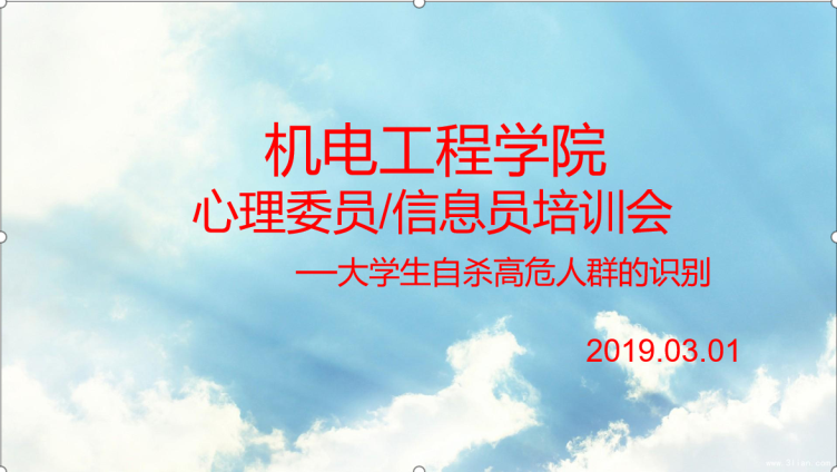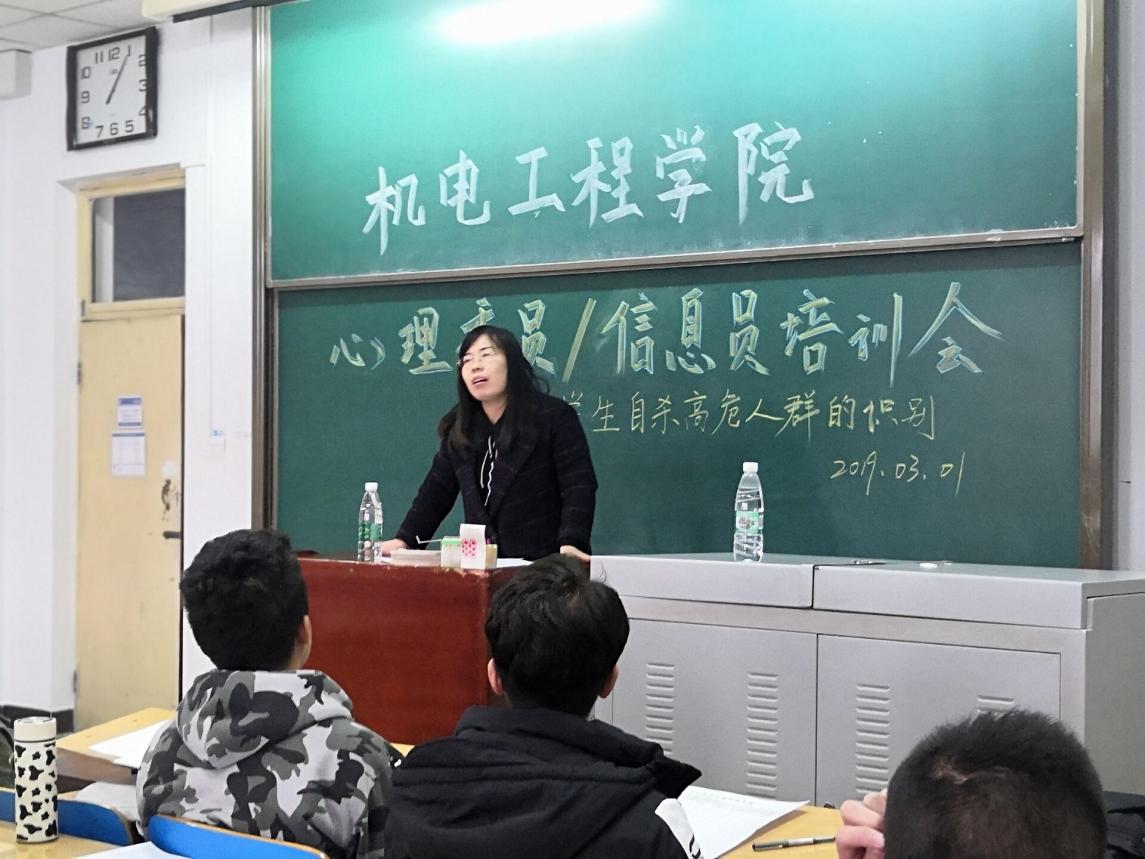 2019年3月1日中午一点于11106H教室召开本学期第一次心理委员、心理信息员培训会,旨在安排本学期重点工作,同时加强对大学生自杀高危人群的识别和研判,最大限度减少极端事件的发生。